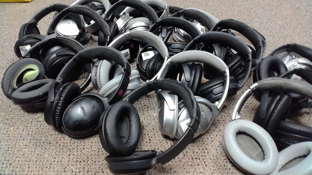 This is a lot of 23 pairs of QC35 Series 1 Bose Noise cancelling headphones with various cosmetic issues. The units are functional but will have missing or worn earpads, worn headbands, scratches, stickers and sticker residue, etc. The lot is being sold as non-working due to the varying cosmetic conditions of the headphones.
