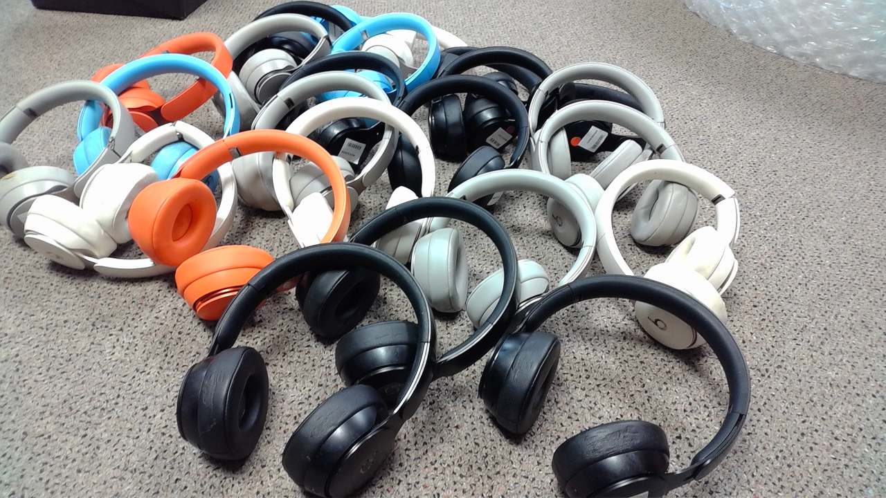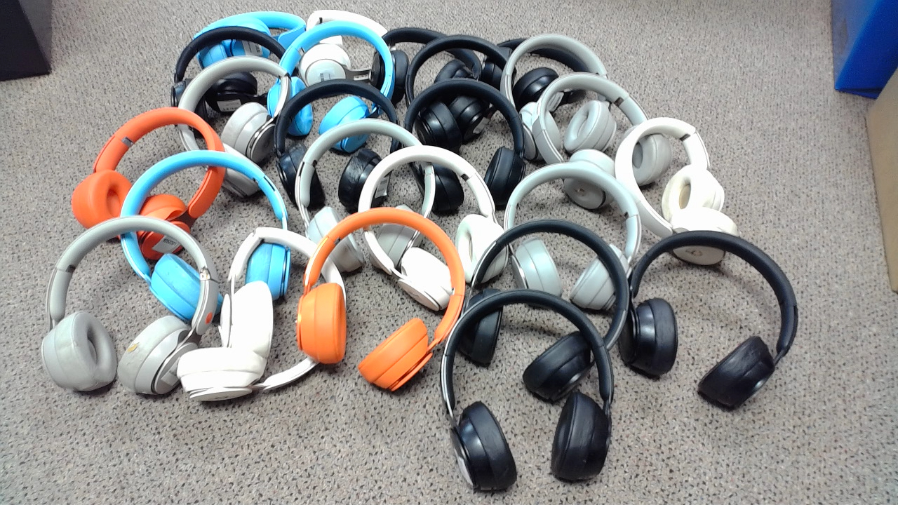 This is a lot of 24 Beats Solo Pro Headphones with various problems including worn earpads and headbands, broken plastic, stickers and sticker residue and some functional issues. Lot is being sold as-is as we have received a large load of headphones in and don't have time to test them all. See our other listings for more bulk lots.