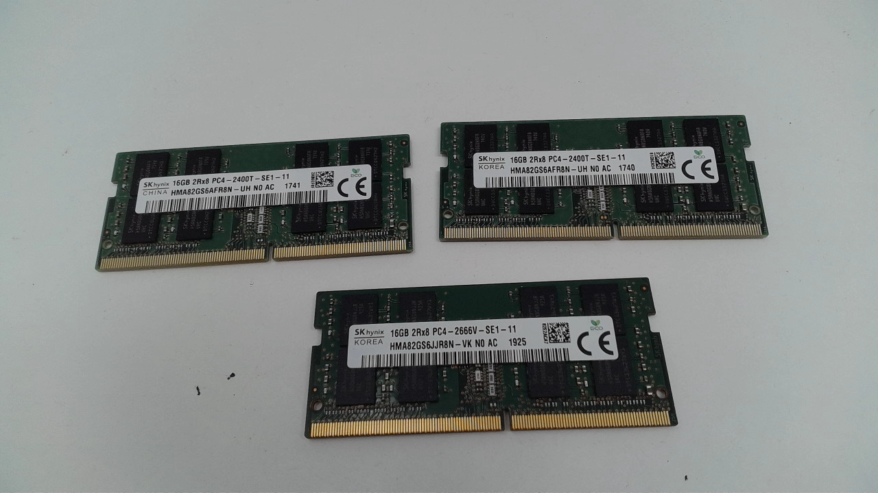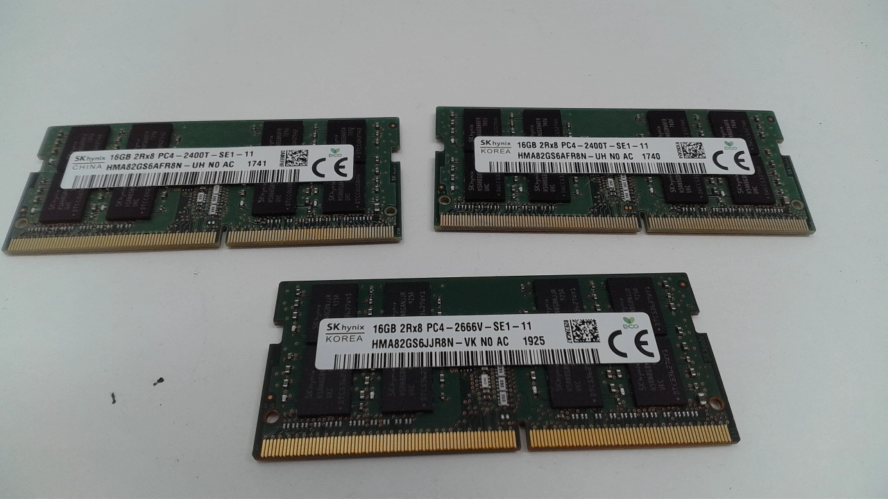 This is a Lot of 3 Pieces of 16GB DDR4 SODIMM Laptop Memory. There are two pieces of 2400T and one piece of 2666V. All are SK Hynix brand.