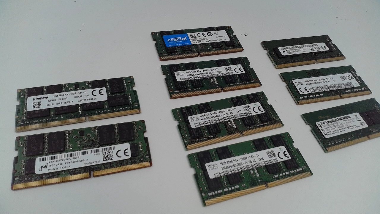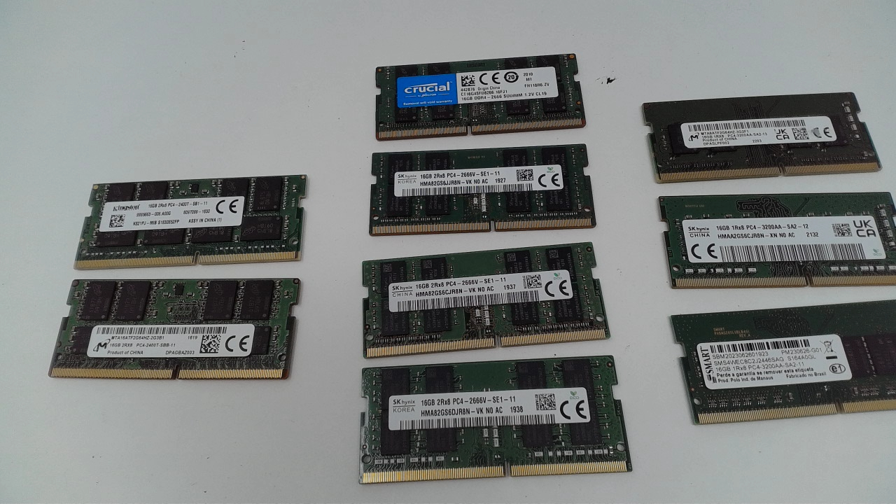 This is a Lot of 9 16GB PC4 DDR4 SODIMM Laptop Memory Ram Mixed Brand And Speeds. There are QTY 4 2666V, QTY 3, 3200, and QTY 2 2400.