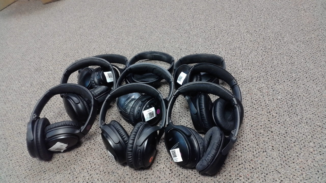 This is a lot of 9 pairs of QC35 Series 1 Bose Noise cancelling headphones with various cosmetic issues. The units are functional but will have missing or worn earpads, worn headbands, scratches, stickers and sticker residue, etc. The lot is being sold as non-working due to the varying cosmetic conditions of the headphones.